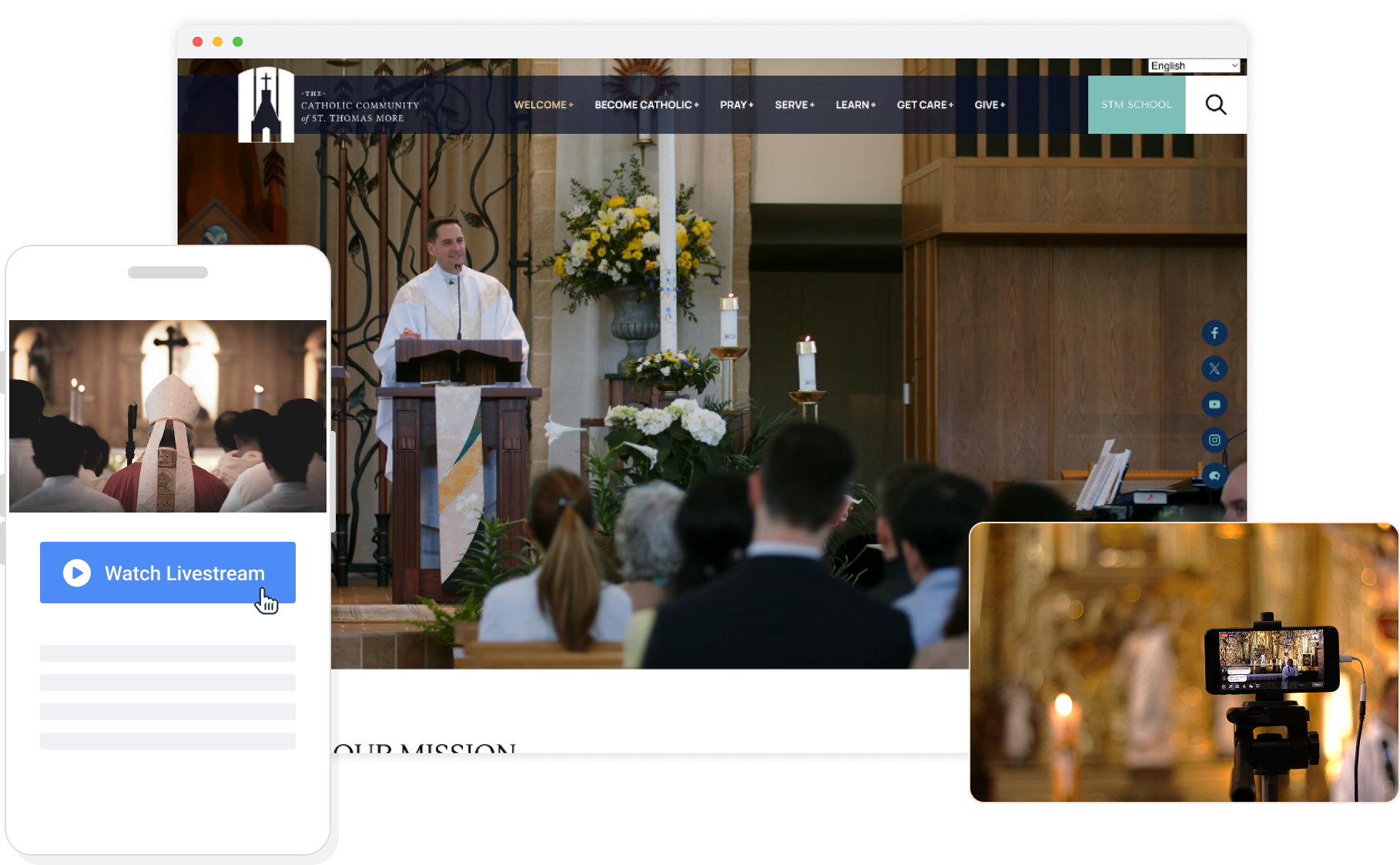 eCatholic LIVE offers automated live content distribution. That means you can schedule and stream your live events on your homepage, Facebook, and other platforms - without physically being there.*