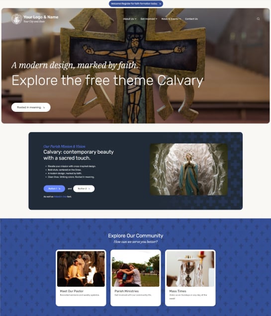 Calvary is a clean, modern theme that pairs bold colors and smooth curves with subtle cross-inspired backgrounds to highlight the core focus of your mission.